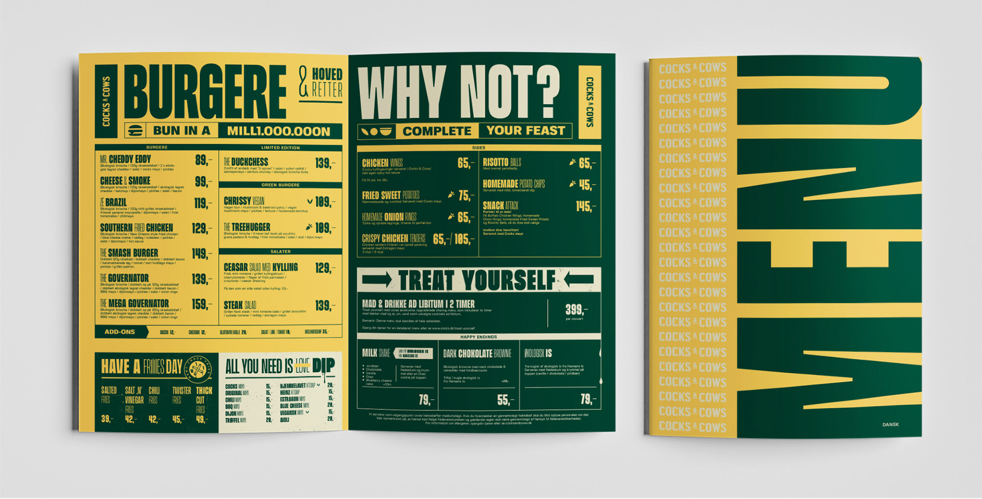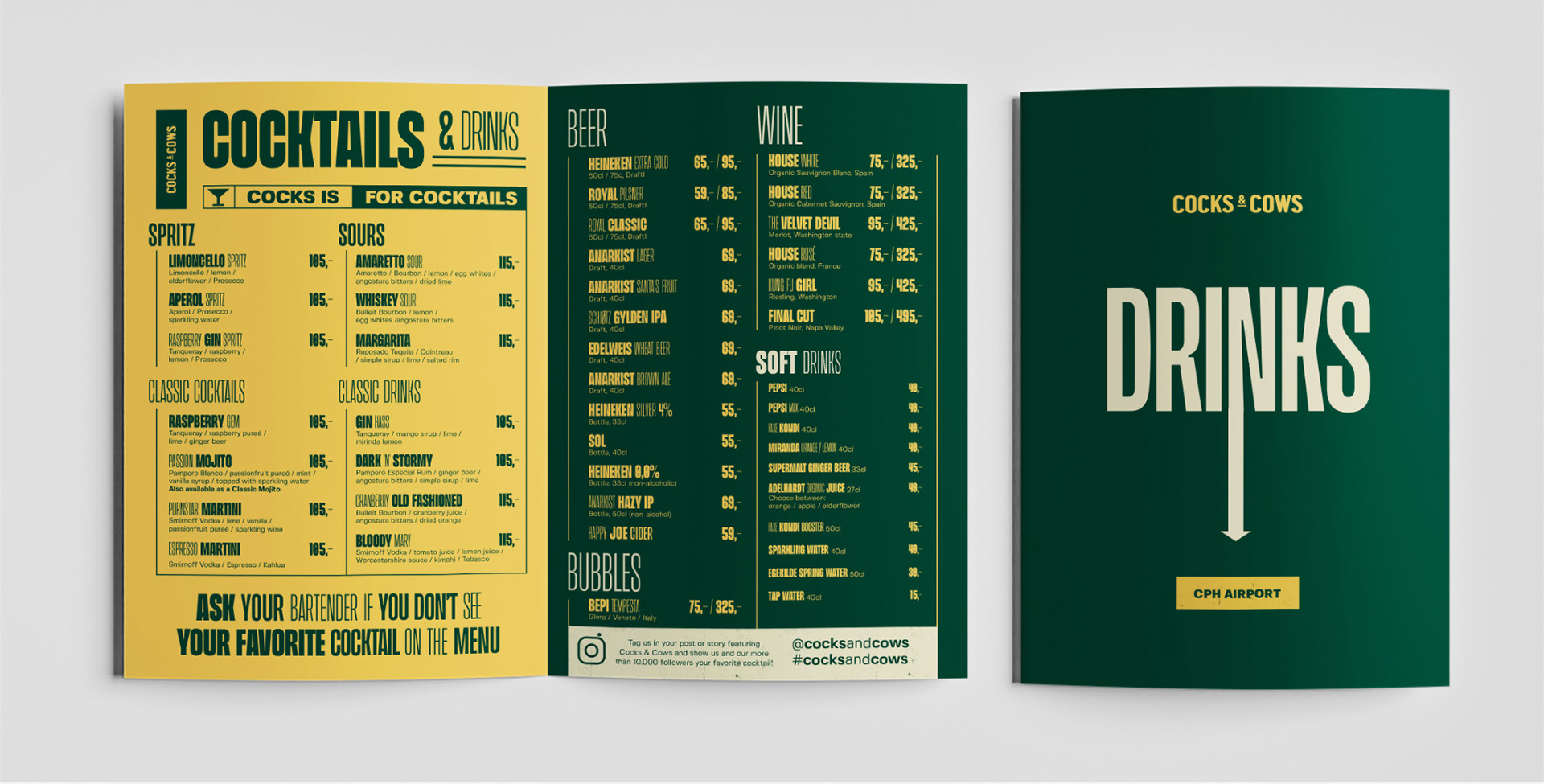 For Cocks & Cows har jeg stået for diverse grafiske opsætning, såsom menukort, drinkskort og plakater til deres restauranter. Mit arbejde har primært fokuseret på layoutdesign og billedredigering, med henblik på at skabe en visuel helhed, der understøtter brandets identitet og giver gæsterne en indbydende oplevelse.
