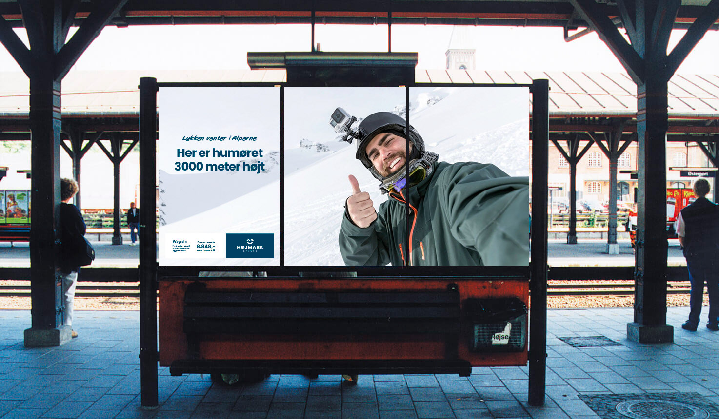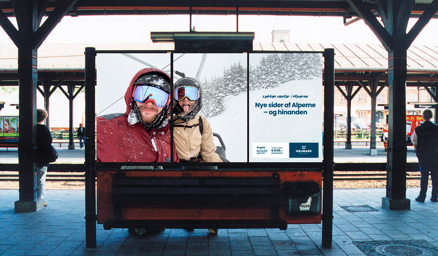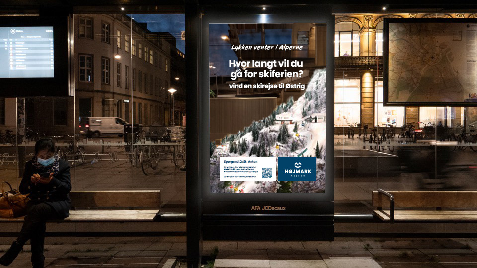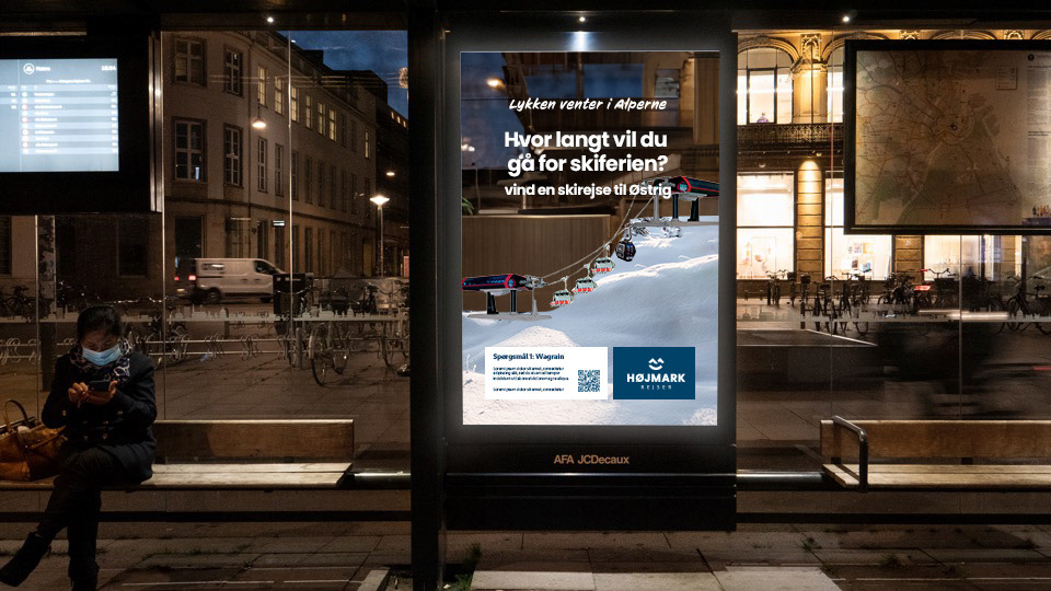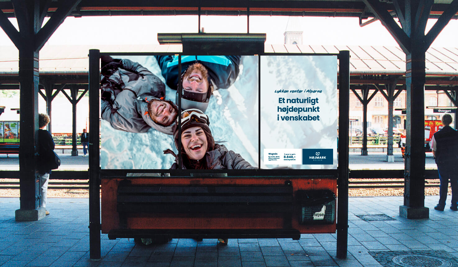 Til Højmark Rejsers sæsonkampagne skabte vi det visuelle koncept "Lykken venter i Alperne" – en kampagne, der satte fokus på de mange oplevelser og glæder, en skiferie kan bringe. Målet var at inspirere og øge salget af skirejser til Alperne. Kampagnen omfattede outdoor-annoncering, konkurrencer med rejsepræmier, content til sociale medier og øvrigt kampagnemateriale, alt sammen med fokus på stemning, fællesskab og rejseglæde.