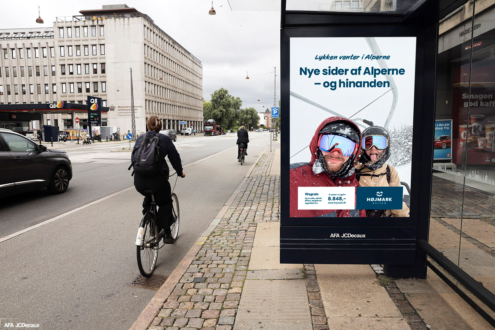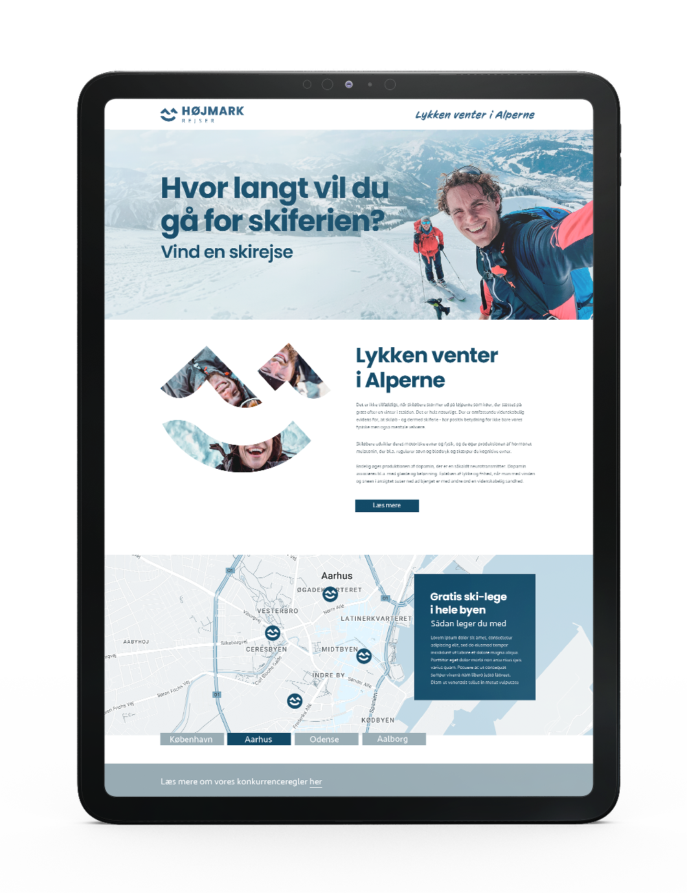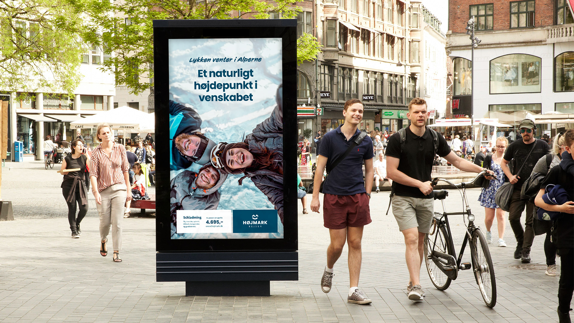 Til Højmark Rejsers sæsonkampagne skabte vi det visuelle koncept "Lykken venter i Alperne" – en kampagne, der satte fokus på de mange oplevelser og glæder, en skiferie kan bringe. Målet var at inspirere og øge salget af skirejser til Alperne. Kampagnen omfattede outdoor-annoncering, konkurrencer med rejsepræmier, content til sociale medier og øvrigt kampagnemateriale, alt sammen med fokus på stemning, fællesskab og rejseglæde.