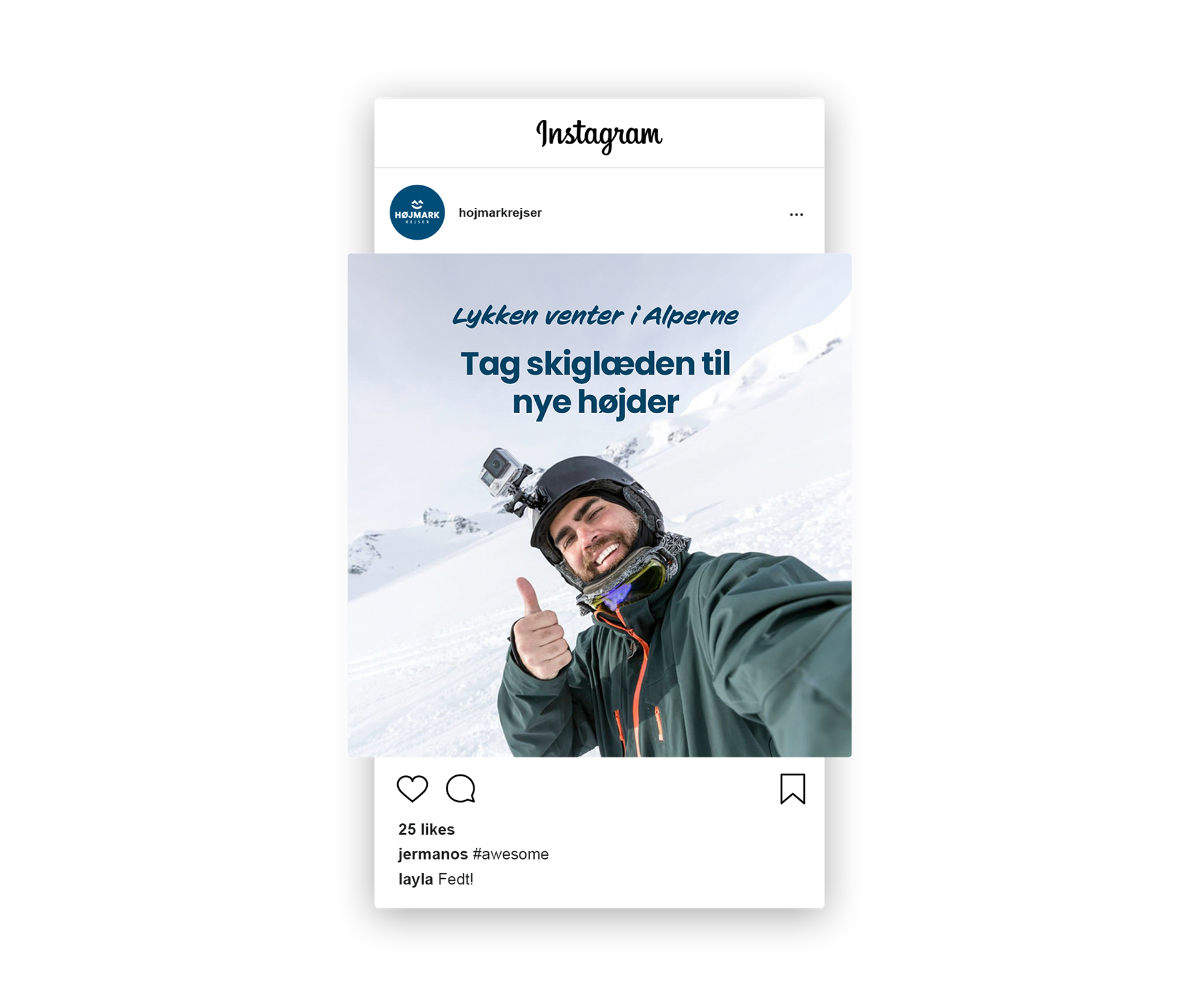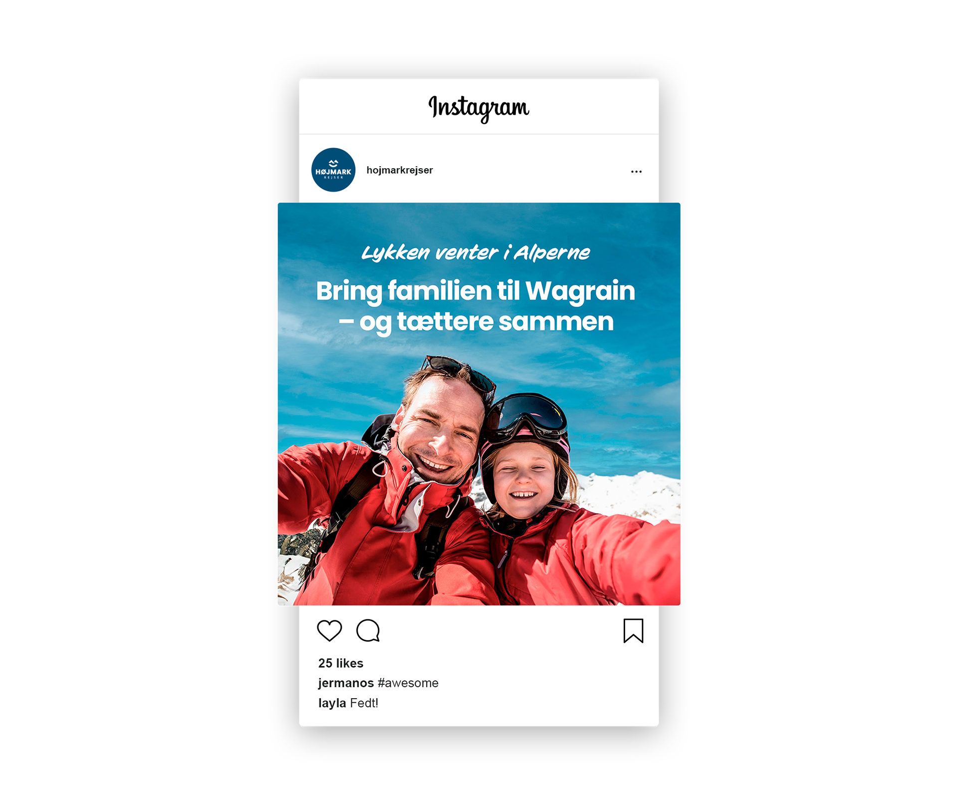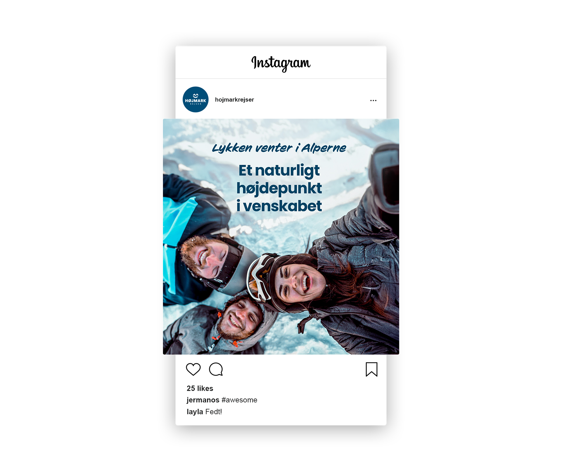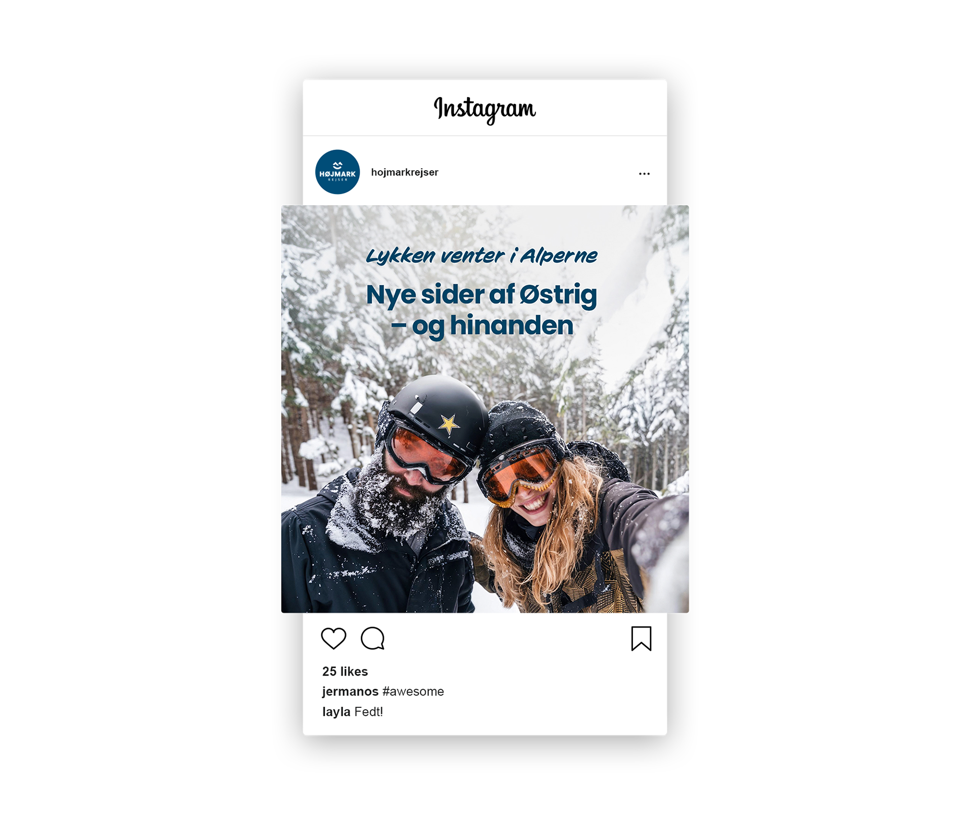 Til Højmark Rejsers sæsonkampagne skabte vi det visuelle koncept "Lykken venter i Alperne" – en kampagne, der satte fokus på de mange oplevelser og glæder, en skiferie kan bringe. Målet var at inspirere og øge salget af skirejser til Alperne. Kampagnen omfattede outdoor-annoncering, konkurrencer med rejsepræmier, content til sociale medier og øvrigt kampagnemateriale, alt sammen med fokus på stemning, fællesskab og rejseglæde.